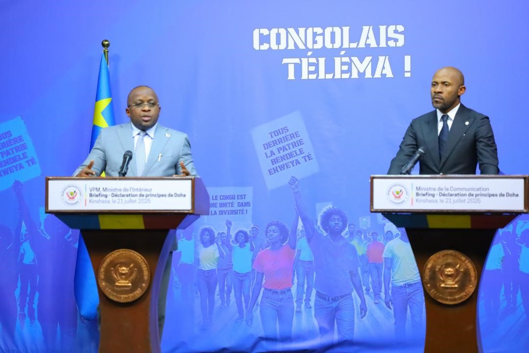 Le Vice-Premier ministre, ministre de l’Interieur, Sécurité, Décentralisation et Affaires Coutumières, Jacquemain Shabani et son collègue de la Communication et Médias, Patrick Muyaya Katembwe, ont co-animé un special briefing presse autour de la déclaration de principes de Doha : enjeux, grandes lignes et perspectives pour la paix durable dans l’Est de la RDC-République démocratique du Congo-, lundi 21 juillet 2025, au Studio Maman Angebi de la RTNC.